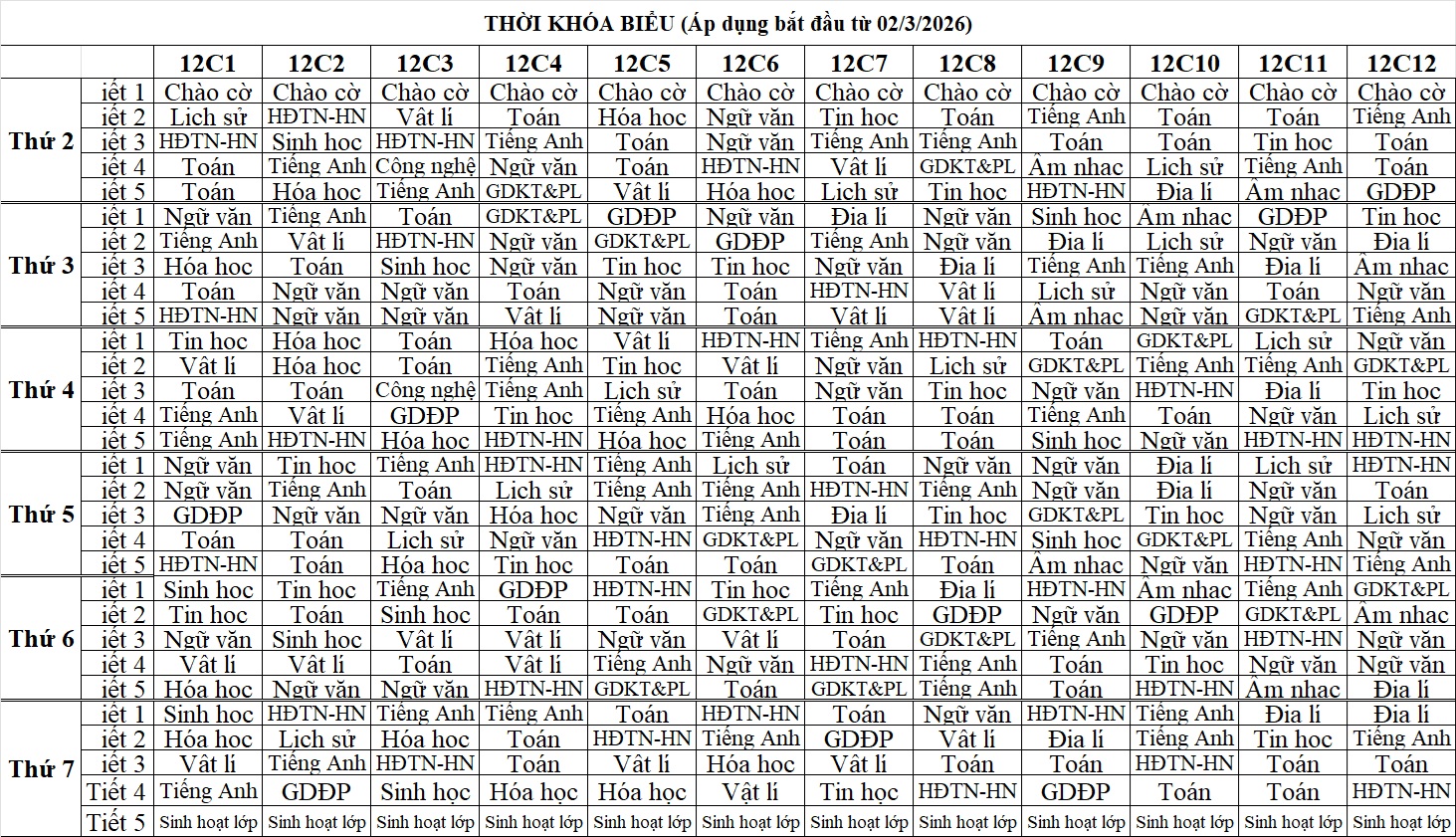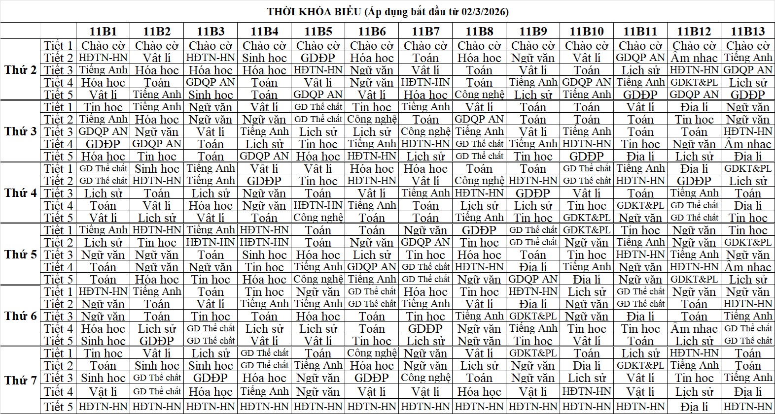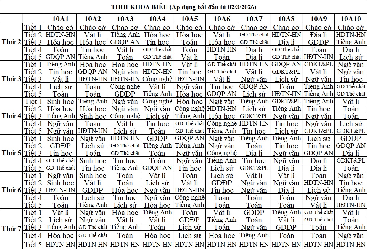 Thời khóa biểu HK2 Lần 2